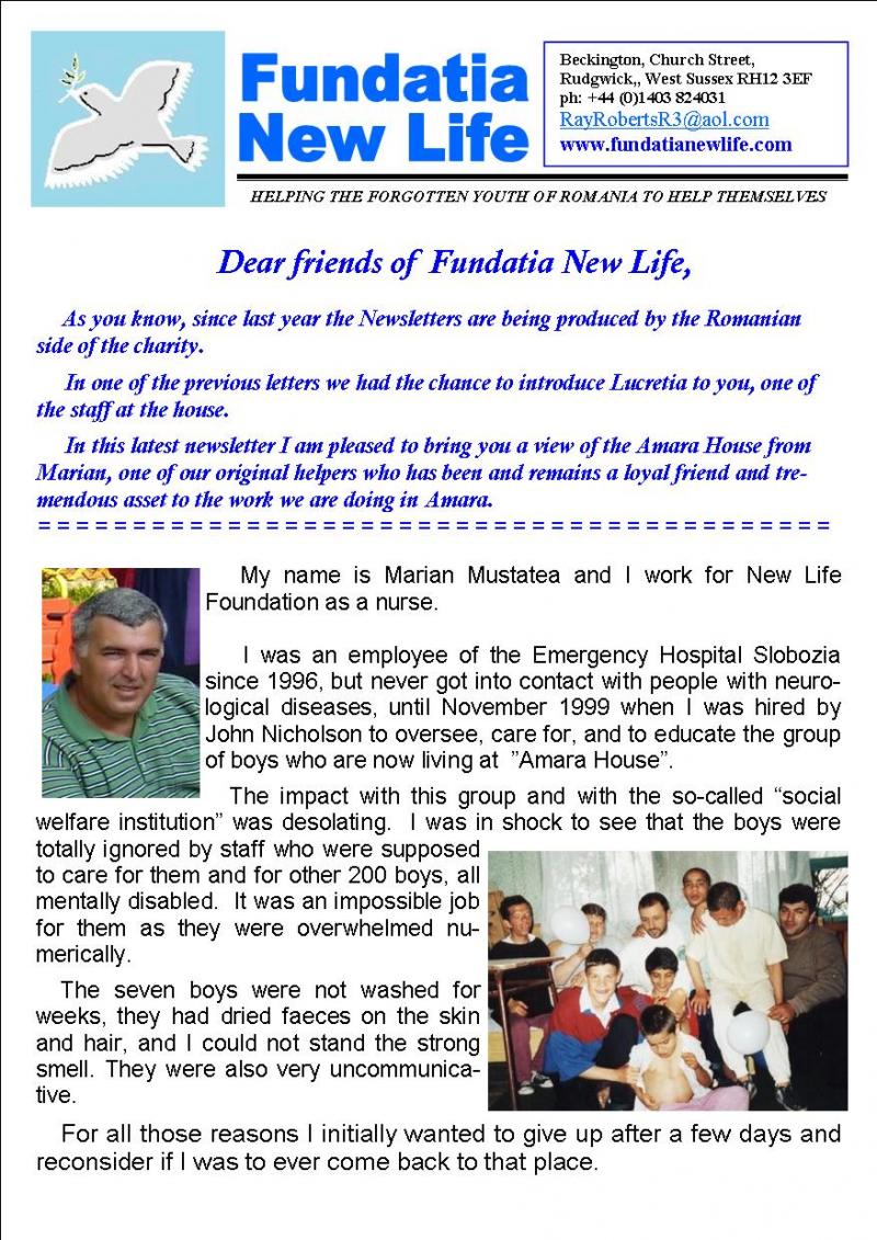 My name is Marius Istrate and I run the romanian side of Fundatia New Life. For me it is the first time to write a letter to you.