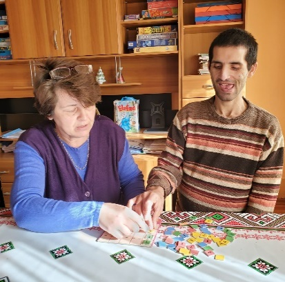 Right next to Valy you will find Emil, always smiling. This time, Gabi was helping him to play „Connect four”. It is one of the games that helps him to exercise his finger muscles as his body degenerates constantly due to his Hurler’s Syndrome.